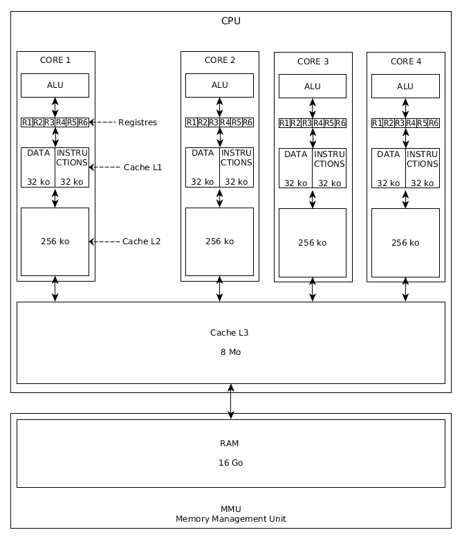 • Toute information en RAM devant être traitée par le CPU doit être recopiée dans le cache L1.