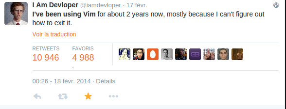 Dans le livre The Pragmatic Programmer, l’un des must read du craftsman, les auteurs (Andy Hunt et Daves Thomas) insistent sans cesse sur le principe D.R.Y (Don’t Repeat Yourself). Il revient sous forme de leitmotiv dans tous les chapitres. Le bon développeur, en vrai artiste, ne se répète pas. En plus de son langage de programmation fétiche (Java, Scala, Ruby, …) il doit disposer d’un IDE configurable dans sa boîte à outils, être à l’aise avec la programmation shell pour automatiser les tâches courantes, et maîtriser du bout des doigts un éditeur de texte, “It is better to know one editor very well, and use it for all editing tasks.” Puis, dans un style messianique, ils décrivent l’éditeur du développeur : “The editor will be an extension of your hand; … Make sure that the editor you choose is available on all platforms you use.” L’éditeur doit être configurable, extensible et programmable. Et voilà pourquoi je veux vous présenter VIM comme étant l’éditeur du Développeur.
