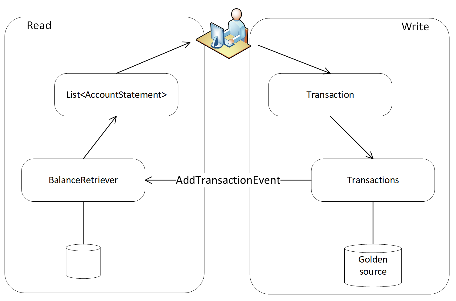 Le schéma correspond bien à ce qu’on veut implémenter dans le CQRS, à savoir la séparation de la partie lecture de celle de l’écriture. Par contre, on peut facilement tomber dans certains pièges. D’ailleurs si on regarde le code, on va se rendre compte qu’une des règles métier est de faire la somme des transactions pour avoir la balance. Mais quand on cherche où est implémentée cette règle, on se rend compte à ce moment là qu’on était tellement focus sur le refactoring pour obtenir une implémentation du pattern qu’on a déporté accidentellement les règles métiers en dehors du domaine. Avant de continuer l’amélioration de l’implémentation du pattern, il faut remonter la règle de gestion dans le domaine. Il faut faire attention à l’étape de transformation car ça peut correspondre à une règle métier et donc doit être placée dans le domaine, et c’est notre cas. Etant donné que le calcul correspond à additionner le montant de la transaction et la valeur de la balance actuelle, le traitement peut, très bien, être placé dans la classe « Transaction » puisqu’on va accéder à ses données internes. Pour le suivi des modifications, j’ai créé une branche correspondante à ce refactoring nommée « MoveCalculationToDomain ». Certes la modification est anodine mais il faut faire attention car c’est très important de déterminer et de garder les règles métier dans le domaine pour séparer les contextes et les responsabilités de chaque élément. Lors des lectures, le modèle d’écriture n’est pas solicité (reduit la contention), on évite des aggregations au moment de la lecture qui peuvent etre couteuses si la quantité de données est importante. On gagne en indépendance des modèles. ## Plus loin encore une fois le pattern implémenté, on se rend compte de la réduction de la contention lors de la lecture. En effet, on présente un modèle simple en évitant les agrégations qui peuvent être couteuses si les données sont volumineuses. Ainsi, on gagne en indépendance des modèles et chacun évolue à son rythme. Pour aller plus loin dans l’implémentation du pattern, on peut très bien imaginer un « service bus » dans lequel on envoie les messages correspondants aux transactions ajoutées. Donc le repository « Transactions » va créer le message et l’envoyer dans ce bus et « BalanceRetriever », qui est à l’écoute (le « listener ») de ce bus, va récuperer les messages au fur et à mesure pour recalculer la balance. Dans certains cas, on peut considérer l’écriture et la lecture comme deux domaines différents et donc mettre une ACL (« Anti-Corruption Layer ») entre les deux. Jérémie Chassaing en parle d’ailleurs dans un interview par ici.