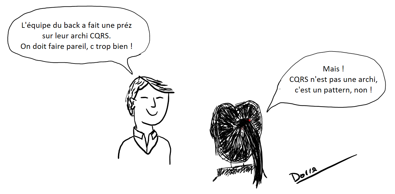 - Il vaut mieux partir sur une solution alternative et ensuite la factoriser pour arriver à l’implémentation du CQRS que l’implémenter au démarrage du projet/fonctionnalité et se rendre compte que le code devient un château de cartes ; dès qu’on touche à une brique, on engendre plusieurs régressions.