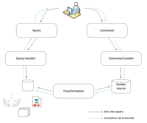 CQRS (Command and Query Responsibility Segregation) est un pattern de séparation des opérations de lecture et d’écriture des informations. Il est présenté pour la première fois par [Greg Young](https://twitter.com/gregyoung Greg). Traditionnellement, les modèles utilisés à la fois pour la lecture et l’écriture ne correspondent pas forcement à tous les cas d’utilisation, notamment ceux de lectures récurrentes de grappes d’objets ou de lectures massives de données. Comme les besoins ne sont pas forcément les mêmes entre l’écriture (write model) et la lecture (read model) des données, CQRS propose alors la séparation des deux modèles et donc de modéliser différemment les données de l’écriture et les données de la lecture. On peut donc utiliser une base relationnelle par exemple pour l’écriture et un graphe comme modèle de lecture. Mais il faut toujours garder en tête que la base d’écriture est notre base de confiance ou de référence (appelée aussi « Golden source »). Deux termes reviennent souvent quand on parle de CQRS :