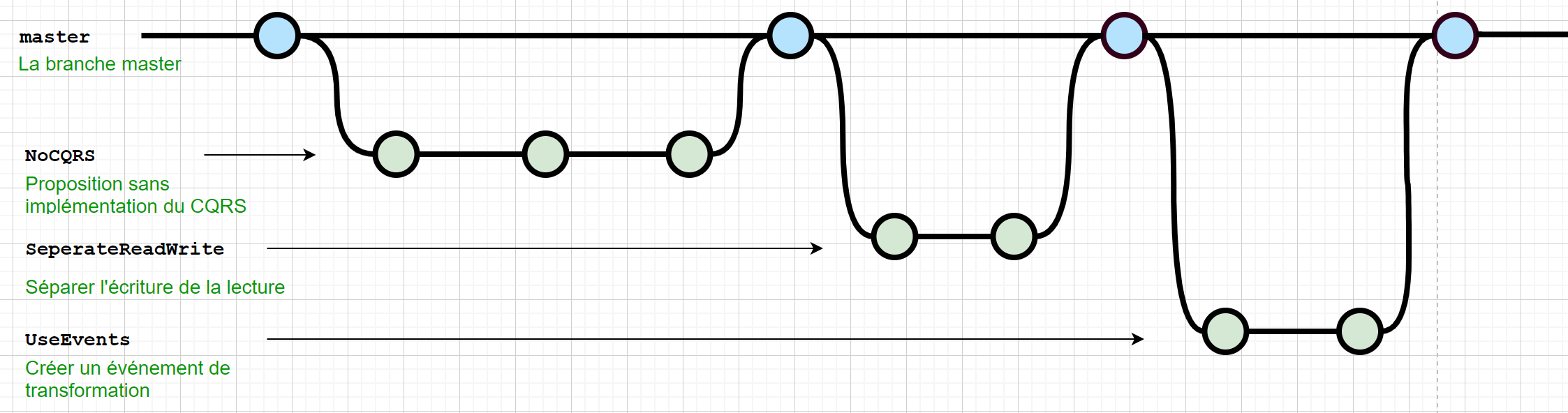 Souvent, quand on présente ce pattern, on le présente sur un kata en mode « green field ». Ce mode consiste à développer le kata de zéro (« from scratch »), sans aucune base de code existante. Pour cet article, j’ai décidé de le présenter sous une autre forme, en mode « brown field ». Je vais donc partir d’une base de code existant que je vais refactorer pour arriver à l’implémentation du pattern. Vous trouverez l’implémentation sur mon github https://github.com/iAmDorra/BankKata_and_cqrs. Ma base de code est sécurisée avec des tests unitaires et des tests d’acceptance. Ces tests représentent mon harnais de sécurité en cas d’erreur de refactoring. Pour en savoir plus sur les tests je vous invite à lire mon article sur le sujet « Différents tests pour un développeur ». Pour simplifier la lecture des commits, j’ai créé une branche par étape d’implémentation comme décrit dans le schéma ci-dessous. Le tout est mergé dans master au fur et à mesure de l’avancement du développement.