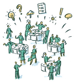 world-cafe-2La conférence démarre officiellement avec le World-café. C’est le moment où les participants se rencontrent pour la première fois. Le Word-café est une forme d’échange qui offre un cadre de discussion informel dans une ambiance de café. Son but est de faciliter l’implication de tous les participants d’une discussion sur un topic. De petits groupes de 8 personnes se forment autour de tables disposées dans plusieurs salles pour échanger sur leurs attentes et motivations à participer à Socrates (What are we here for ? Where do we want to go ?) . Chaque table a un chef “fixe” qui joue le rôle de facilitateur. Au bout de 15 minutes, les groupes se dispersent, de nouveaux groupes s’organisent pour un nouveau round. Le processus se répète plusieurs fois. A la fin, les résumés des différentes discussions sont affichés sur des tableaux mis à la disposition du public.