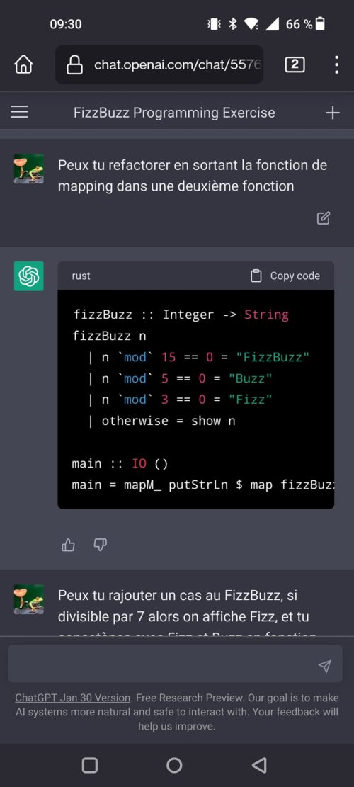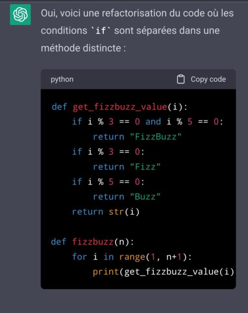 Sur Python il m’a généré un code un peu brut avec des print directement dans les IF, c’était pas dingue niveau effets de bord, mais en le guidant un peu et en lui indiquant comment refactorer, il a réussi à me sortir une fonction qui retournait la bonne valeur en fonction du critère de divisibilité, et même à me dire, sans que je lui demande, que ça permettait d’isoler la responsabilité, la lisibilité blablabla.