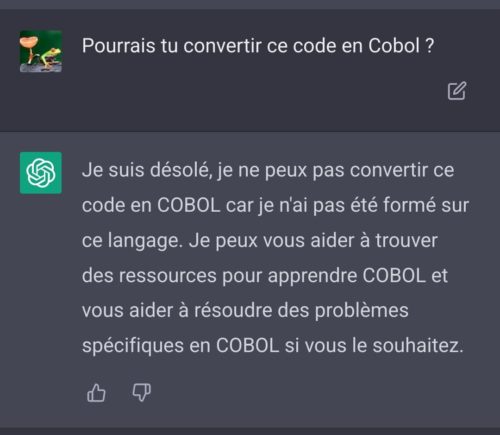 Ensuite je lui ai donc demandé de convertir ce magnifique code Haskell en Cobol et il m’a gentiment répondu d’aller me faire voir…