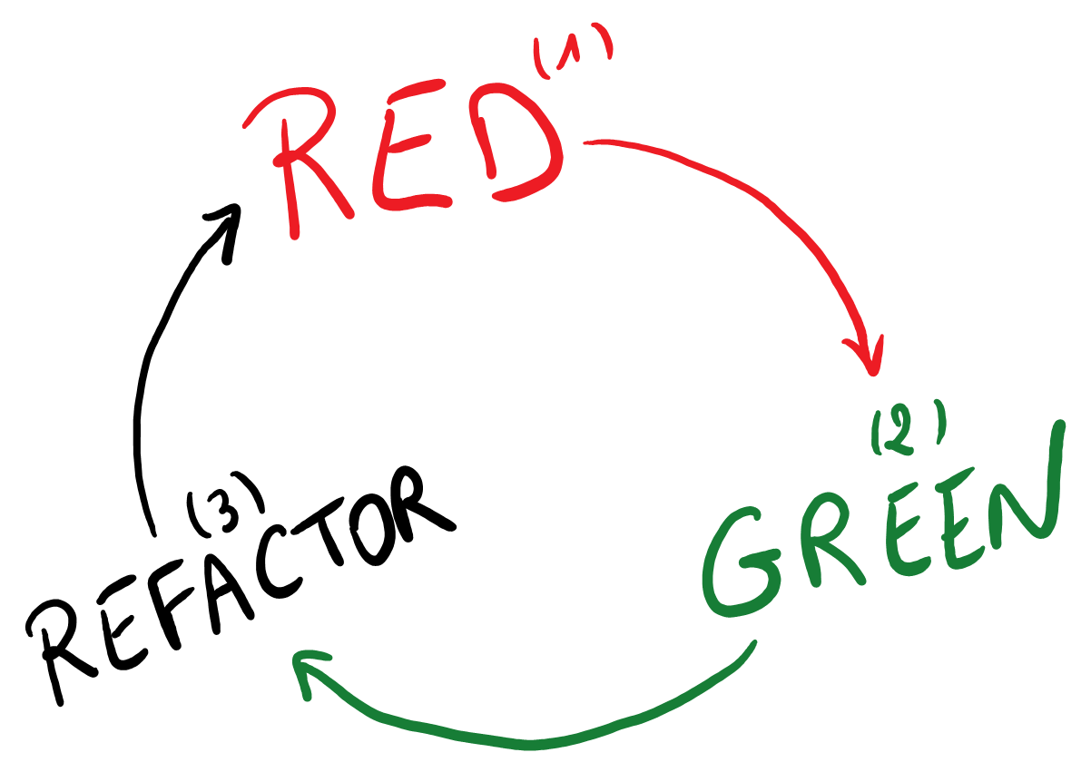 « Test-Driven Development » est une méthode qui prône une nouvelle gymnastique de l’esprit et une nouvelle discipline : écrire le test avant le code de production. L’idée est donc de se fixer un objectif à atteindre en écrivant un test. Ce dernier permet de savoir quand s’arrêter de développer le comportement attendu. Dans un premier temps, le test sera rouge à l’exécution puisque le comportement du code correspondant n’existe pas encore. Attention la phase rouge ne veut pas dire que le code ne compile pas. On doit donc avoir créé manuellement ou généré via l’IDE la méthode à appeler. La deuxième phase correspond à écrire le minimum de code pour que le test passe au vert. Et enfin la factorisation du code permet de l’améliorer et d’obtenir une meilleure lisibilité et maintenabilité en troisième phase. On parle alors du cycle « Red Green Refactor » comme présenté dans l’image ci-dessous.