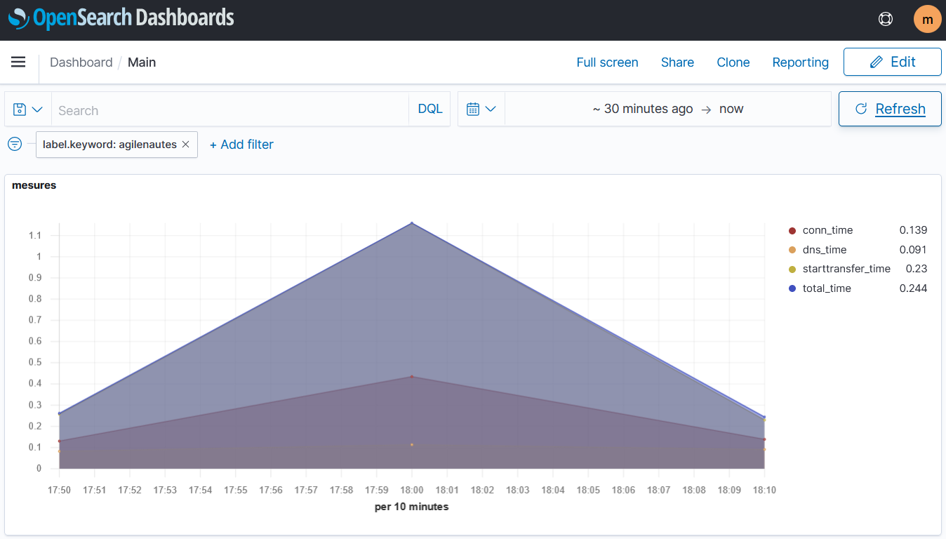 (1): En vrai j’ai changé de modèle de donnée depuis : avant, je poussais un objet par ping et par URL, avec les quatre mesures dans quatre attributs de cet objet maintenant je pousse quatre objets, un par mesure, avec le nom de la mesure dans un attribut. Bonne pratique data, plus facile à gérer dans Kibana.