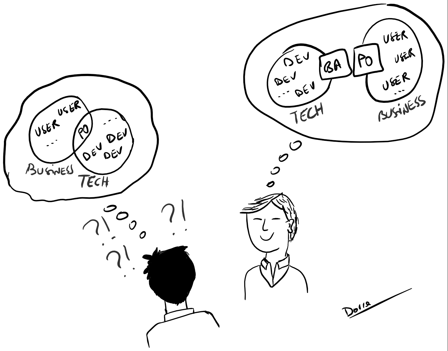 D’après Walterspeople, le role de Business Analyst est une « interface indispensable entre les départements opérationnels de l’entreprise et le service informatique ». Son rôle consiste à « analyser le processus d’information et les stratégies mis au service de la prise de décision quotidienne de sa société afin d’en évaluer l’efficacité ou d’apporter les ajustements nécessaires ». Parallèlement à ça, dans de nombreux articles, le rôle du PO est corrélé aux approches agile, même si cette notion peut être séparée. Le ou la PO est défini(e) comme un membre de l’équipe qui connait le produit, crée et maintient le backlog en priorisant les US et il est surtout disponible pour apporter des précisions et des indications en cas de besoin. En réalité, le PO et le BA peuvent correspondre au même rôle. Dans les grands groupes, j’observe qu’on trouve souvent les deux car le BA remplace le PO qui, entre les déplacements et les tâches du quotidien, n’est pas disponible tout-le-temps.