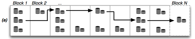 Une nouvelle transaction se trouve provisoirement dans une liste, puis une fois validée elle est ajoutée à la liste des transactions validées qui sont regroupées dans une chaine de blocks.