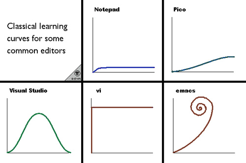 L’esprit de Vim est de réaliser toutes les actions possibles sans avoir besoin de lever les mains du clavier, en se passant de la souris et des touches éloignées. Sa courbe d’apprentissage en forme de mur (Learning wall) peut être interprétée de la manière suivante : On ne s’investit qu’une seule fois, pour toujours.
