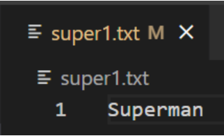 Reprenons par exemple notre fichier super1.txt. A l’intérieur, écrivons le texte “Superman” et enregistrons-le. Le nom du fichier devrait alors prendre une couleur orangée dans l’interface et notre chère icône de contrôle de versions devrait indiquer qu’un changement a été effectué.