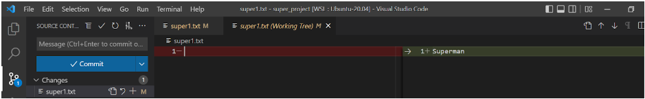 L’éditeur ouvre alors un onglet dans lequel on peut apercevoir les différences entre la dernière version commitée de super1.txt et la modification que nous avons effectuée.