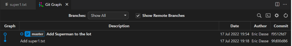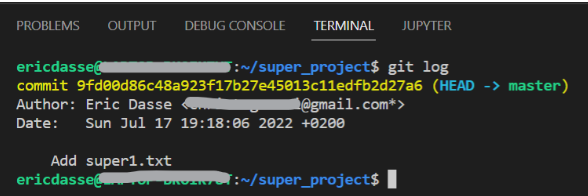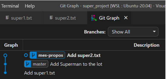 Ensuite, créons un fichier super2.txt puis faisons un add et un commit avec pour message “Add super2.txt”.