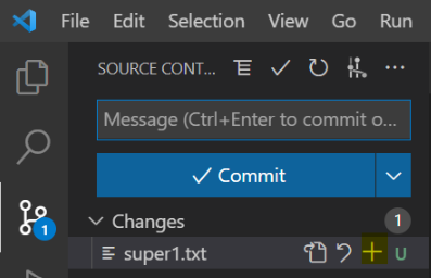 Maintenant que le projet est ouvert, crée un fichier nommé super1.txt au sein de ce projet. Tu constateras alors que l’icône précédemment mentionnée est maintenant affublée d’un “1” bien rond ! Ce symbole signifie que tu viens de créer ou modifier un fichier et que tu devrais effectuer un commit pour ces changements.
