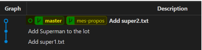 A l’aide du graphe git, on voit bien les commits de la branche mes-propos et ceux de la branche master.