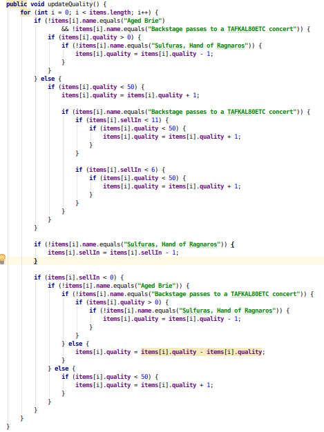 A la lecture du code, on ne retrouve pas vraiment les règles métiers énoncées par l’aubergiste. L’ensemble est peu clair, avec plusieurs niveaux de branchements imbriqués et de nombreux effets de bord (en violant allègrement plusieurs principes et bonnes pratiques du clean code). Les choses se présentent donc plutôt mal …