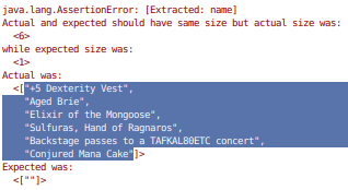 C’est une situation dont il faut tenir compte. Ici malheureusement, il faut expérimenter, tatonner et construire le jeu de tests de façon laborieuse. D’autres kata de refactoring (comme le TripService de Sandro Mancuso) mettent en avant des techniques pour se faciliter la vie, mais ce n’est pas l’objet du kata auquel nous nous intéressons en ce moment.