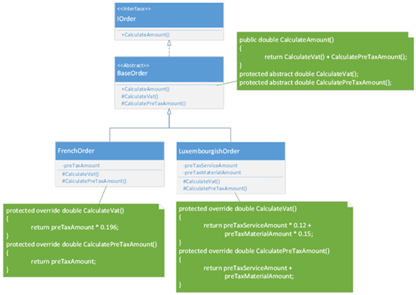 Quand on factorise pour créer une classe mère abstraite, on peut définir le calcul du montant total qui est commun aux deux classes filles. Par contre ce qui est spécifique aux classes filles, on le définit en tant qu’abstrait au niveau de la classe mère. Ainsi on a juste à le spécifier au niveau des classes filles. Ci-dessous une solution de factorisation de notre exemple. Elle implémente le « design pattern » (modèle de conception) « Template method ». Ce pattern fait partie de ceux du Golf (Gang of Four) décrit dans le livre « Design Patterns: Éléments of Reusable Object-Oriented Software » écrit par Erich Gamma, Richard Helm, Ralph Johnson, et John Vlissides, avec une préface de Grady Booch.