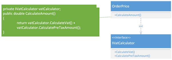 OrderPrice avec la méthode CalculateAmount qui utilise IVatCalculator avec le calcul de TVA et la pre-taxe
