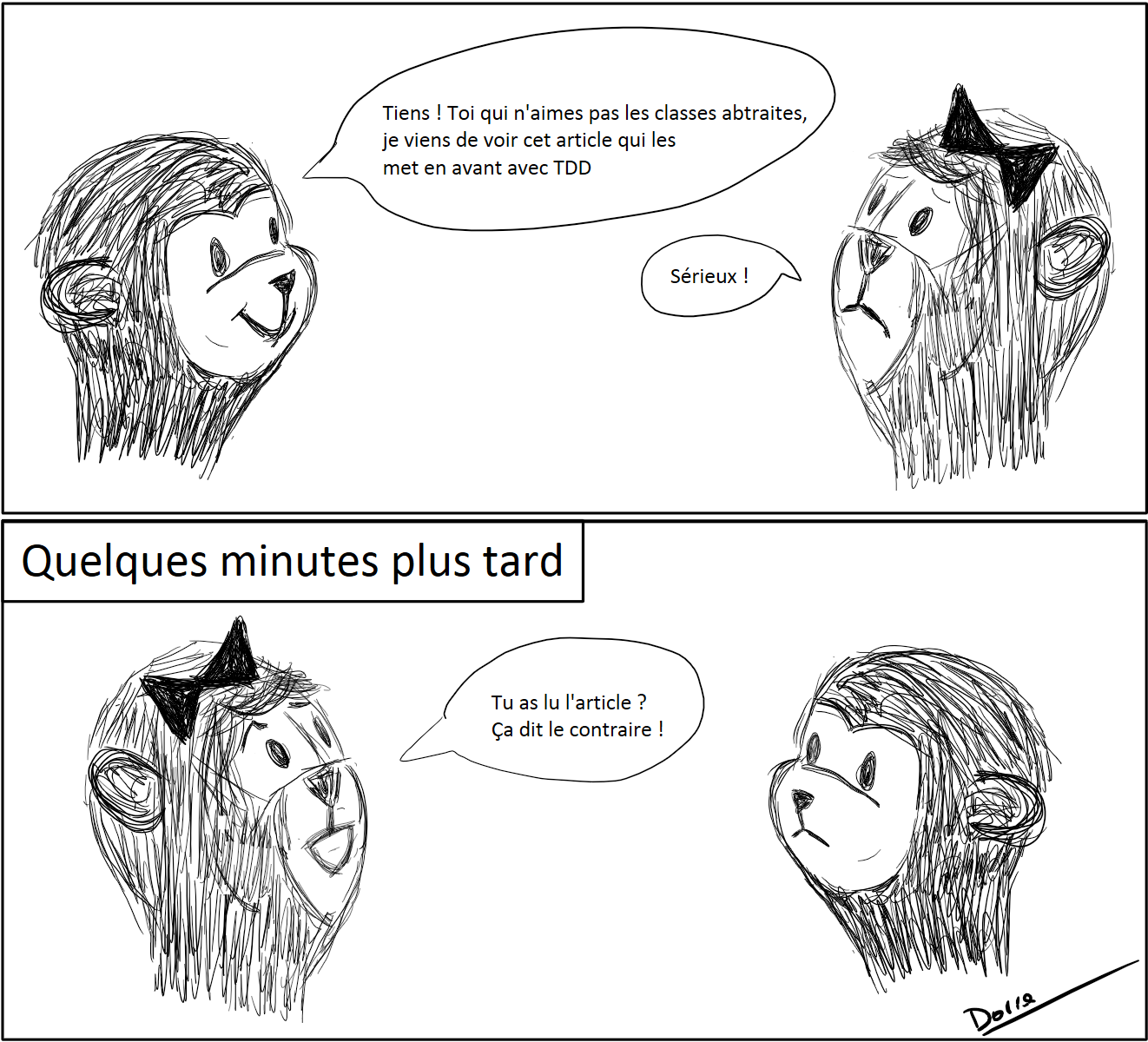 Discours entre deux singes. Le premier dit : Tien toi qui n'aimes pas les classes abstraites, je viens de voir cet article qui les met en avant avec TDD, et la guenon après avoir lu l'article lui répond : tu as lu l'article, ca dit le contraire.