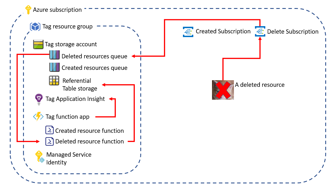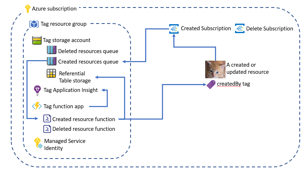 Event Grid Subscription sera utilisé pour récupérer les événements de création, de mise à jour ou de suppression de ressources. Les Azure Functions permettront d’effectuer un traitement suite à ces événements.
